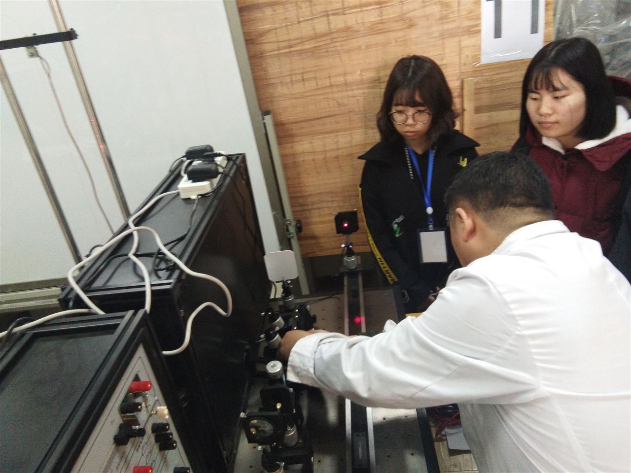 在比赛中,指导老师为参赛学生讲解仪器的使用注意事项。(我公司产品力电光综合实验仪作为本次物理竞赛的使用仪器)